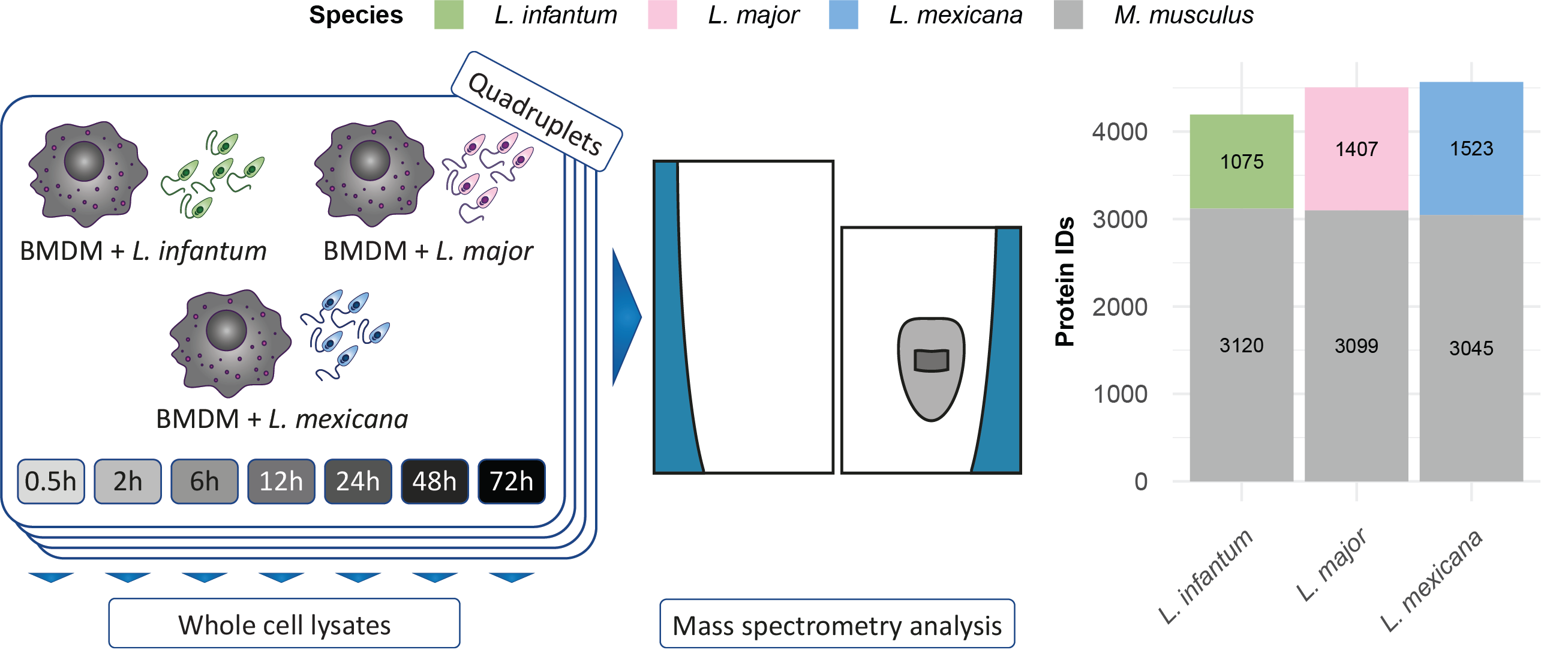 The Leishmania infectome screen quantifies Leishmania spp. and M. musculus proteomes at seven post-infection timepoints.